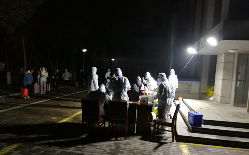 11月1日23點30分,自治區黨校隔離點開始接收隔離人員,一輛輛救護車開了進來。保持一米距離排好隊、驗碼、測溫、掃碼,“把嘴張大、啊、口罩戴好……”馬永莉與工作人員,忙碌到黎明時分,完成了370多人的核酸采樣工作,并將他們妥善安排在了各自的隔離房間內。