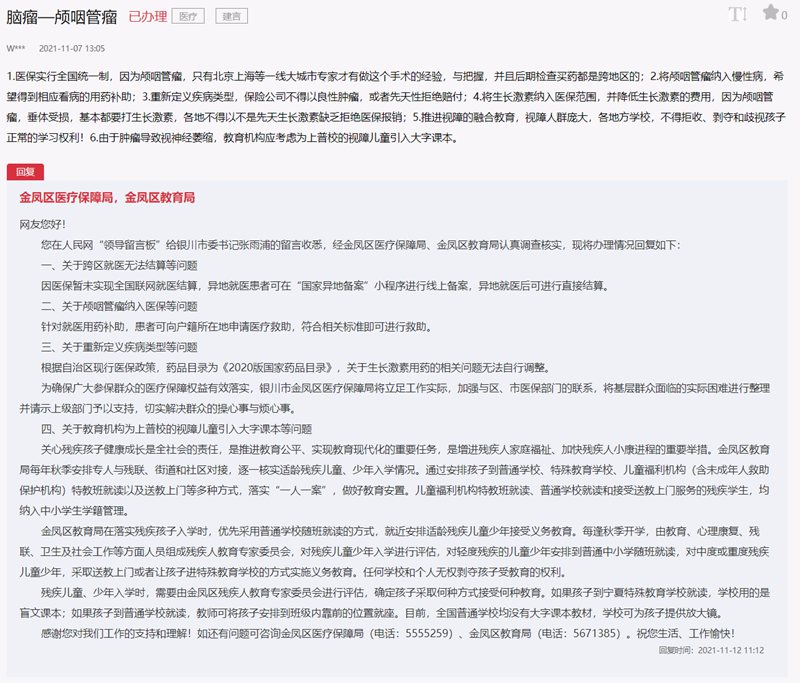 對此,銀川市金鳳區醫療保障局回復稱:因醫保暫未實現全國聯網就醫結算,異地就醫患者可在“國家異地備案”小程序進行線上備案,異地就醫后可進行直接結算。關于顱咽管瘤納入醫保等問題,針對就醫用藥補助,患者可向戶籍所在地申請醫療救助,符合相關標準即可進行救助。