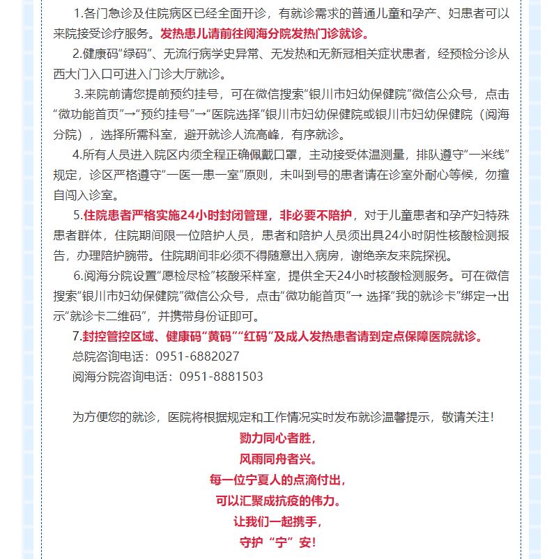 1.各門急診及住院病區已經全面開診,有就診需求的普通兒童和孕產、婦患者可以來院接受診療服務。發熱患兒請前往閱海分院發熱門診就診。