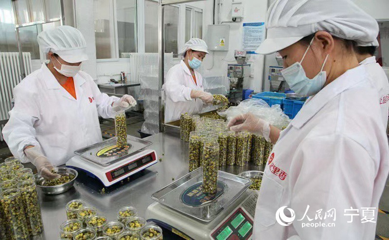 銀川市西夏區杞里香同陽新村扶貧車間內,工人正在裝配菊花茶。人民網 趙茉鈺攝