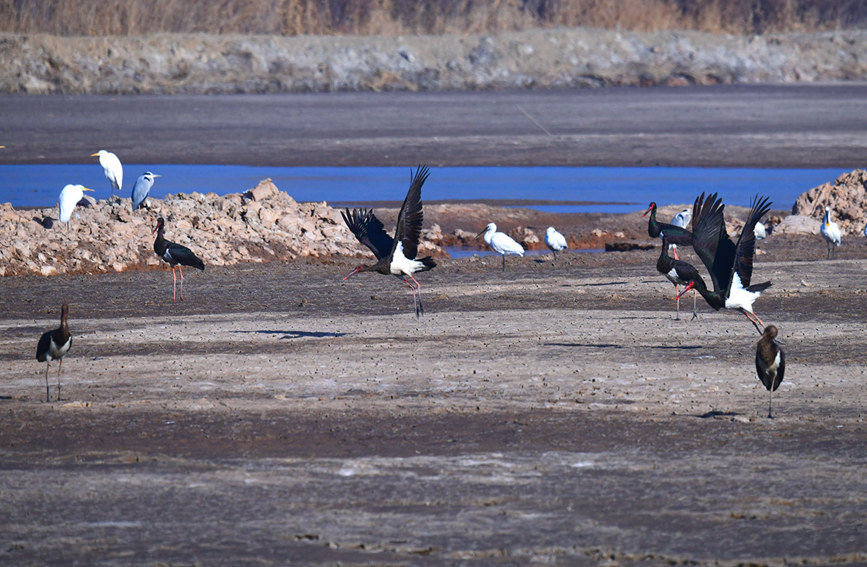 黑鸛在沙湖東部淺灘水域出現。岳昌鴻攝