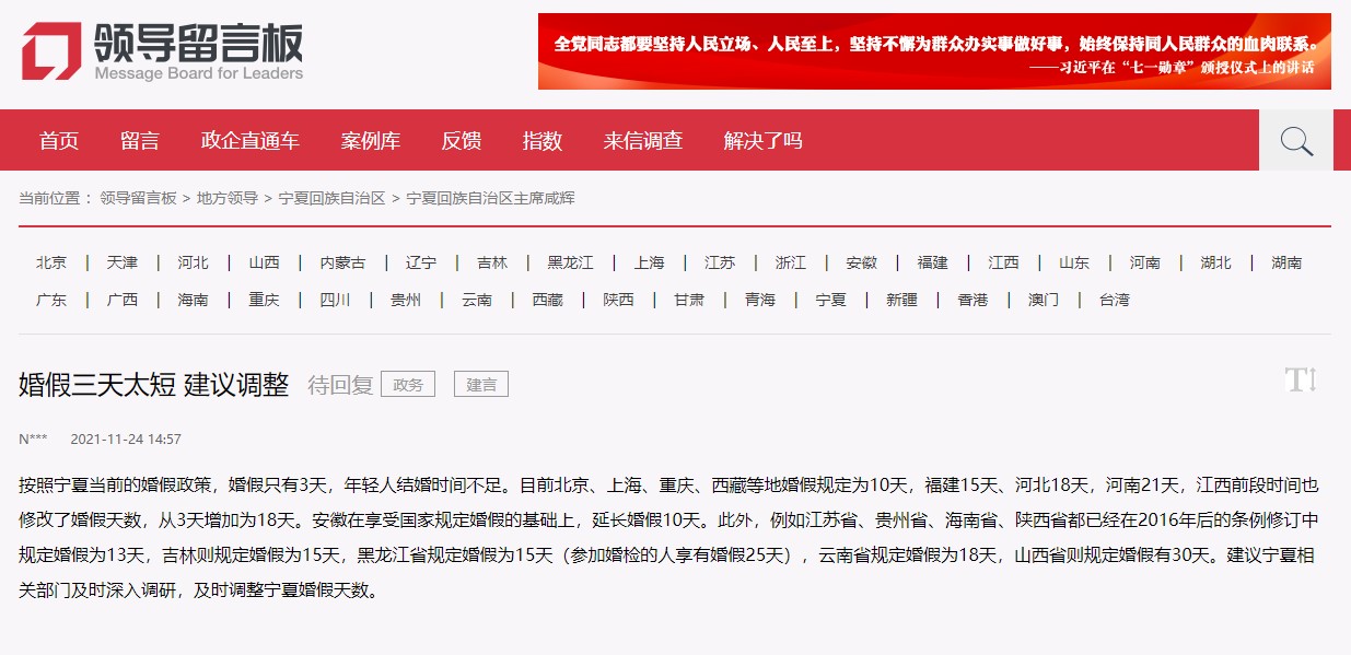 人民網銀川12月1日電 (梁宏鑫)近日,有網友在人民網“領導留言板”留言表示,“按照寧夏當前的婚假政策,婚假只有3天,年輕人結婚時間不足!