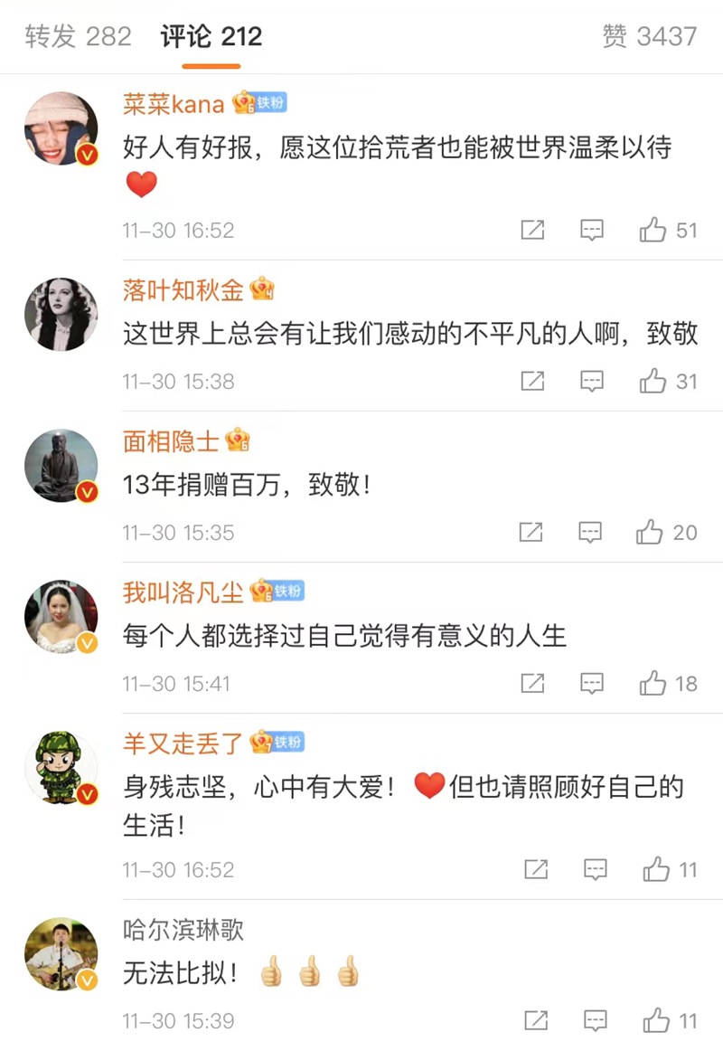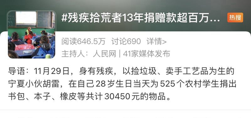 11月30日,“殘疾拾荒者13年捐贈款超百萬元”沖上微博熱搜,這一行為打動無數網友。