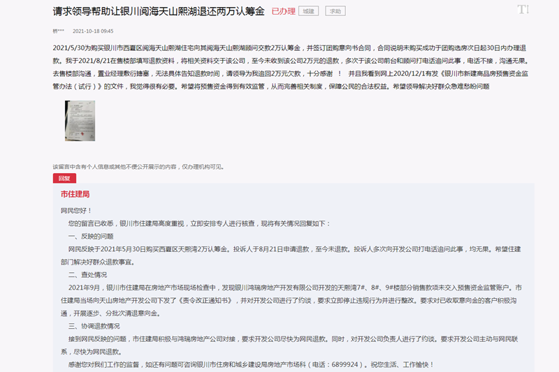 “今年5月30日,我在銀川市天山熙湖售樓處繳納2萬的認籌金并簽訂團購意向書用于購買房屋。于8月21日在售樓部填寫退款資料,至今未收到該公司2萬元的退款!苯,寧夏銀川市的網友劉先生在人民網“領導留言板”留言求助相關部門,希望房地產商盡快退款。對此,銀川市住房和城鄉建設局公開回復辦理,目前,該網友已收到退款。
