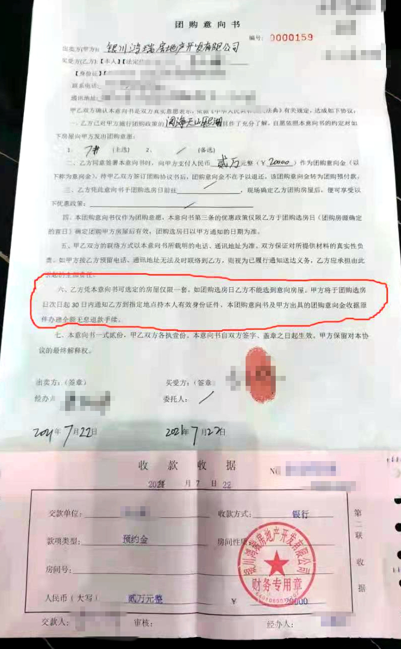 網友劉先生留言稱,“在購買銀川市西夏區閱海天山熙湖住宅時,向閱海天山熙湖顧問交款2萬認籌金,并簽訂團購意向書合同,合同說明未購買成功于團購選房次日起30日內辦理退款。后填寫退款資料,至今未收到退款。多次于該公司前臺和顧問打電話追問此事,電話不接,溝通無果。去售樓部溝通,置業經理敷衍搪塞,無法具體告知退款時間!倍啻螠贤o果的劉先生,無奈之下在人民網“領導留言板”留言,希望相關單位能介入解決。