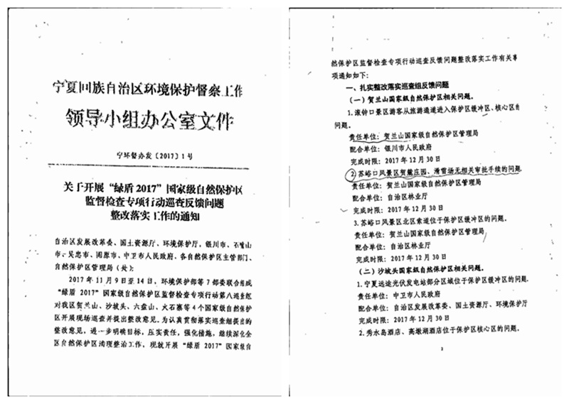 2017年11月11日,國家“綠盾2017”國家級自然保護區監督檢查專項行動第八巡查組對賀蘭山國家級自然保護區(銀川段)開展情況及保護區人類活動整改落實情況現場巡查時發現,蘇峪口風景區滑雪場“無相關審批手續”,要求2017年12月30日前完成整改,“限期補辦相關手續或者由自治區人民政府與國家林業局等主管部門協調出臺統一的處理方案”。