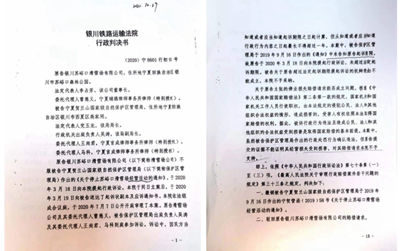 2020年3月18日,蘇峪口滑雪場公司就2份《通知》提起行政訴訟,銀川鐵路運輸法院判決如下:撤銷賀蘭山管理局2019年9月與10月作出的2份《通知》,駁回蘇峪口滑雪場公司的賠償請求。