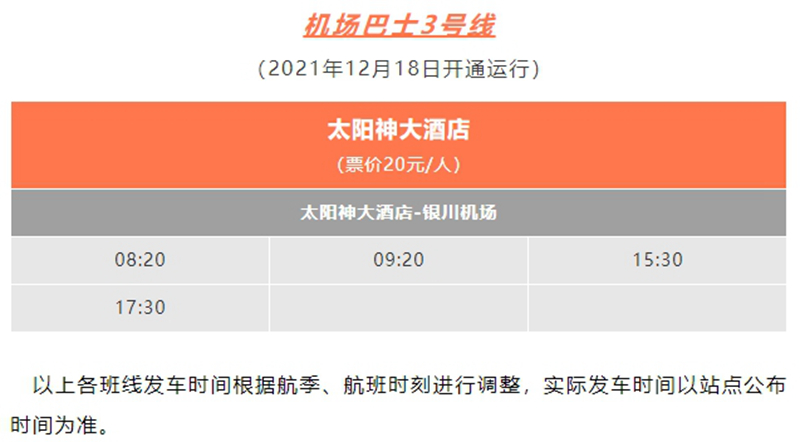 銀川機場巴士太陽神大酒店站點將于12月18日開通