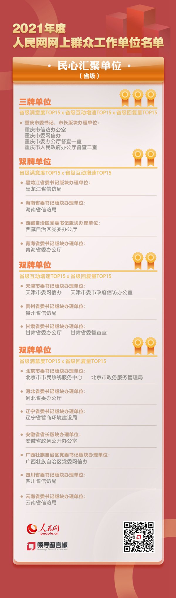 此次公布的名單綜合全國各地區各部門各單位近一年來在回復率、群眾點評滿意度、制度創新等方面的熱力指數,篩選出“匯智為民單位”“民心匯聚單位”“實干擔當單位”500家。在面向省市縣三級留言辦理單位設置的“民心匯聚單位”名單中,省級留言辦理單位入圍29家,市縣兩級分別入圍208家和224家。其中,省級分設“省級滿意度top15”“省級互動增速top15”和“省級回復量top15”三個榜單。