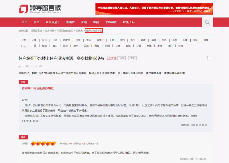 收到留言后,青銅峽市裕民街道辦事處解決了周先生的困難,并公開作出回復;貜头Q,“12月14日,社區工作人員與您樓下住戶協商,已將一樓至三樓被堵的共用排水立管進行了更換維修,現在整個樓棟的下水暢通!