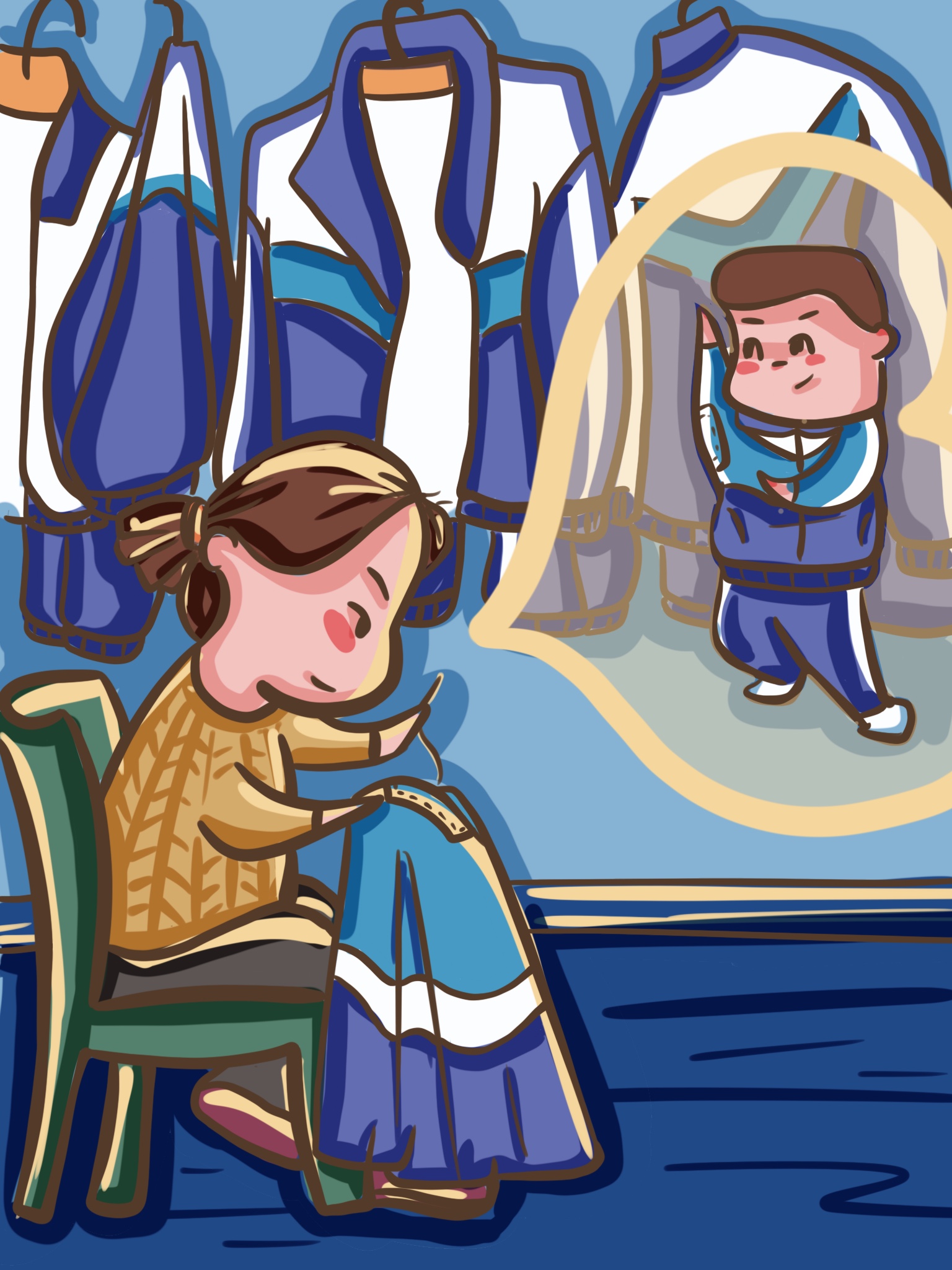 有些學生的校服上有小的破洞,李老師就順手拿起家里的針線縫了起來