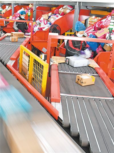 順豐速運銀川興慶中轉場,快遞經過自動分揀機,準確投遞到下一級網點地址。電子面單大數據形成的物聯網,令分撥效率和準確率大大提升。
