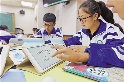 銀川市興慶區月牙湖二中智慧課堂上,同學們使用平板電腦同步答題,老師用手機軟件實時拍攝,F代通訊技術讓鄉村與城市課堂同步。