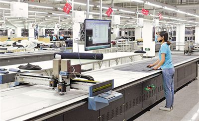 銀川濱河如意服裝有限公司,工作人員正在操作智能數控裁床。曾經20個工人的裁剪工作量現在僅需1個工人就能完成, 實現了從量體裁剪、縫紉、整燙直到智能配對倉儲的不落地式生產流程一體化和信息傳遞的無縫對接。