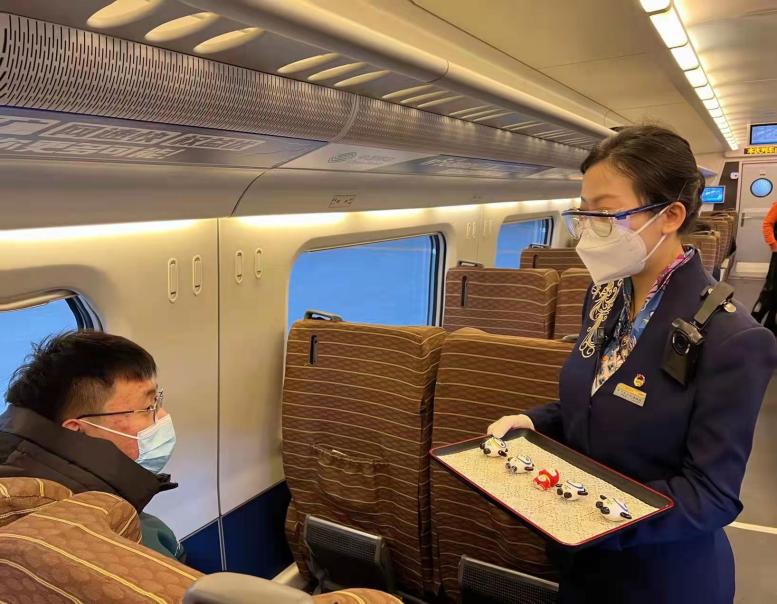 列車工作人員為乘客贈送“冰墩墩”玩偶。中鐵蘭州局銀川客運段供圖
