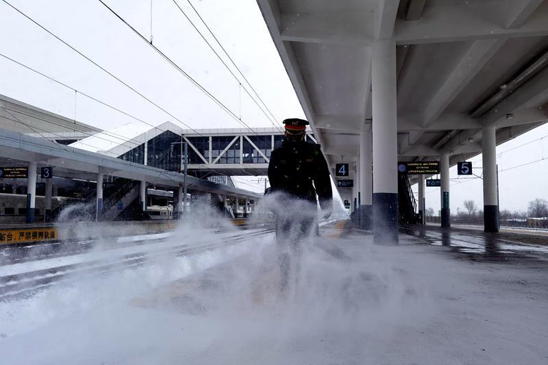 正月十五22時25分,最后一趟車到達,“老譚”和同事們組織完旅客出站后,又開始了掃雪……