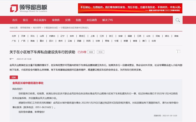 收到留言后,銀川市金鳳區長城中路街道辦事處回復表示,經核查,林湖左岸社區多次聯合金鳳區綜合執法局處理金鳳天山熙湖小區地下車庫私建洗車行一事,經過協調處理已于2022年1月24日前將所有設備拆除,并且搬離金鳳天山熙湖小區。