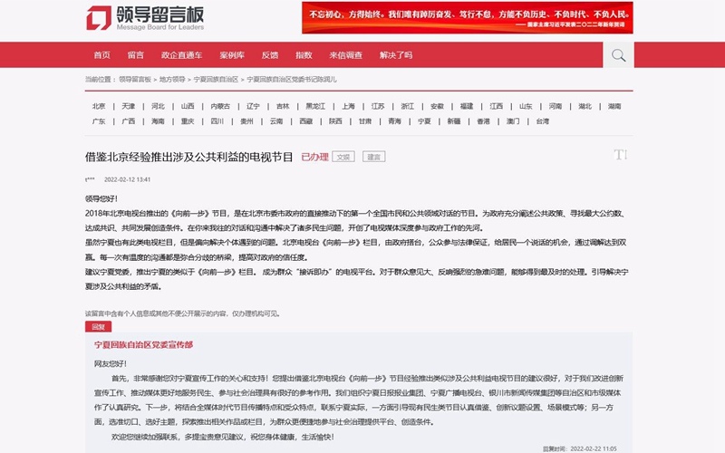 回復稱,下一步,將結合全媒體時代節目傳播特點和受眾特點,聯系寧夏實際,一方面引導現有民生類節目認真借鑒、創新議題設置、場景模式等;另一方面,選準切口、選好主題,探索推出相關作品或欄目,為群眾更便捷地參與社會治理提供平臺、創造條件。