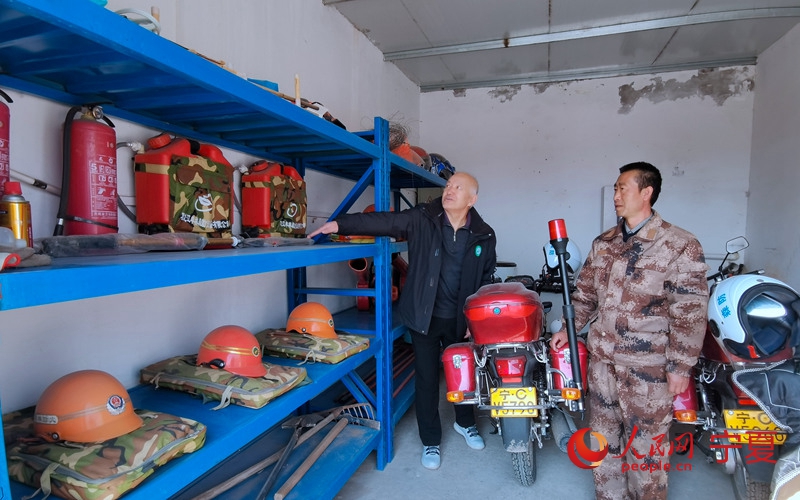 吳全成(左)介紹防火工具。人民網 穆國虎攝