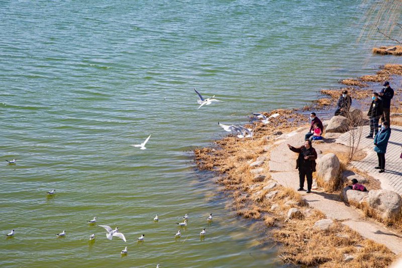 市民在公園投喂紅嘴鷗。 張海峰攝