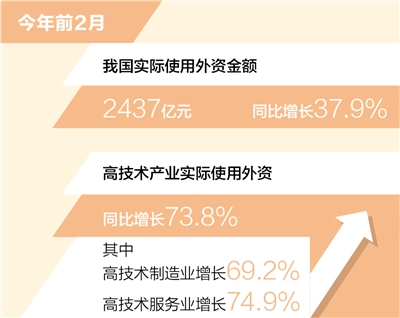 記者14日從商務部獲悉:今年前2月,我國實際使用外資金額2437億元,同比增長37.9%。