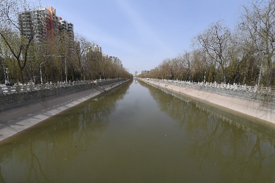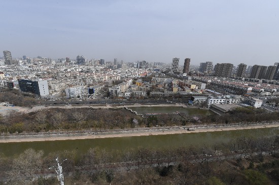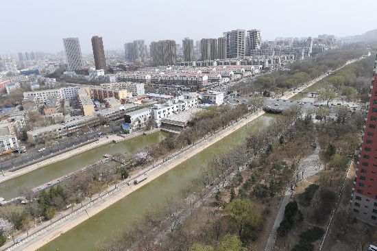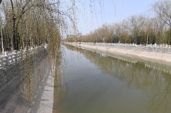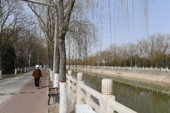 3月17日,唐徠渠內黃河水緩緩流淌,人們在渠畔休閑散步。