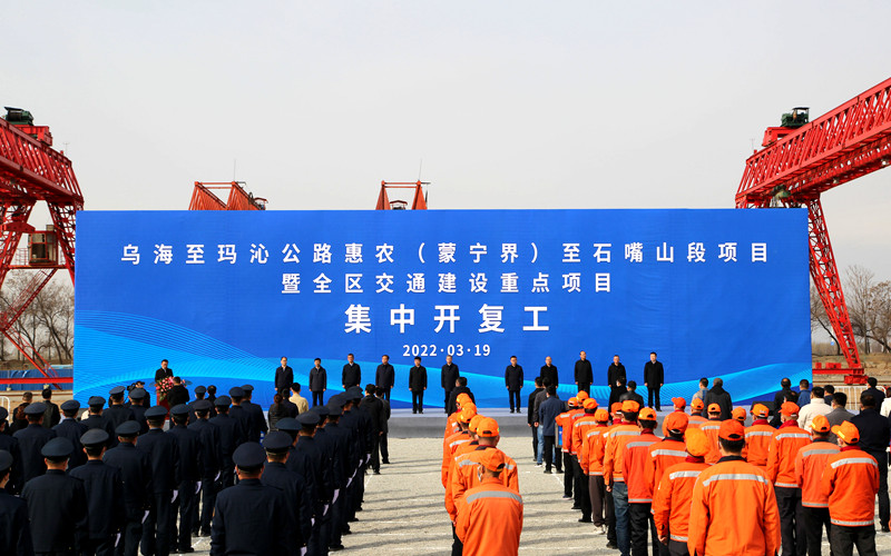 人民網銀川3月19日電 (劉峰、穆國虎)伴隨著陣陣鳴笛聲,寧夏吹響了2022年交通項目建設的沖鋒號。3月19日上午,烏海至瑪沁公路惠農(蒙寧界)至石嘴山段項目暨全區交通建設重點項目集中開復工儀式在大武口區星海湖鎮舉辦。