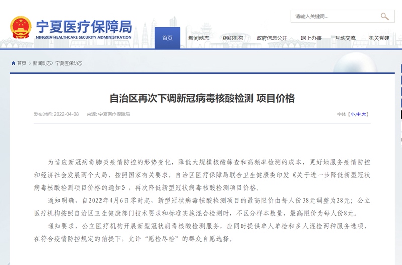 人民網銀川4月8日電 (秦瑞杰、閻夢婕)按照國家有關要求,寧夏回族自治區醫療保障局聯合衛生健康委印發《關于進一步降低新型冠狀病毒核酸檢測項目價格的通知》,再次降低新型冠狀病毒核酸檢測項目價格。自2022年4月6日零時起,新型冠狀病毒核酸檢測項目的最高限價由每人份38元調整為28元;公立醫療機構按照自治區衛生健康部門技術要求和標準實施混合檢測時,不區分樣本數量,最高限價為每人份8元。