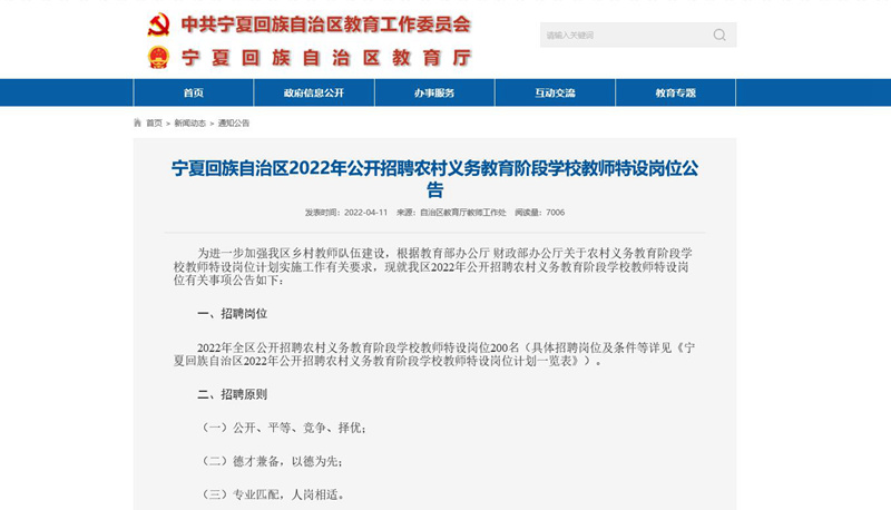 人民網銀川4月11日電 (劉峰、穆國虎)4月11日,寧夏回族自治區教育廳官網發布《寧夏回族自治區2022年公開招聘農村義務教育階段學校教師特設崗位公告》,據《公告》所示,2022年,寧夏賀蘭縣、青銅峽市、同心縣、紅寺堡區、原州區、中寧縣、海原縣等7縣(市、區)公開招聘農村義務教育階段學!疤貚徲媱潯苯處200名。
