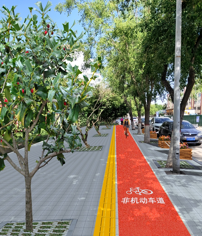 “我們在道路兩側不同路段設置了自行車道和盲道,這樣上班族既可考慮騎行也可考慮步行,走在盲道上就能聞見一路花香,多樣化出行選擇就是為了讓大家體驗感、獲得感更高!苯瘌P區住房城鄉建設和交通局副局長耿肖薇表示。