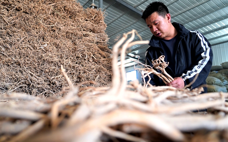 4月10日,神林鄉觀音村山花爛漫。育苗大戶張妹霞帶著工人,撿拾挖藥機翻出的藥苗。她家育了700畝黃芪、黃芩苗子。這些地塊是去年新推的地,種得有點遲,加之去年夏天大旱,出苗率未達到張妹霞的預期!霸谡D攴,每畝苗能移栽3畝地呢!2022年,隆德縣加大六盤山中藥材種質資源保護利用力度,在溫堡鄉南山村、神林鄉觀音村等打造7個中藥材規范化種植示范點,在甘渭河、渝河流域建設5萬畝生態種植與野生資源修復區,建設1個有機中藥材試驗示范基地,在沙塘鎮新民村、陳靳鄉新和村等地建成3個集種植、養生保健、旅游康養等服務為一體的中醫藥健康旅游示范區。