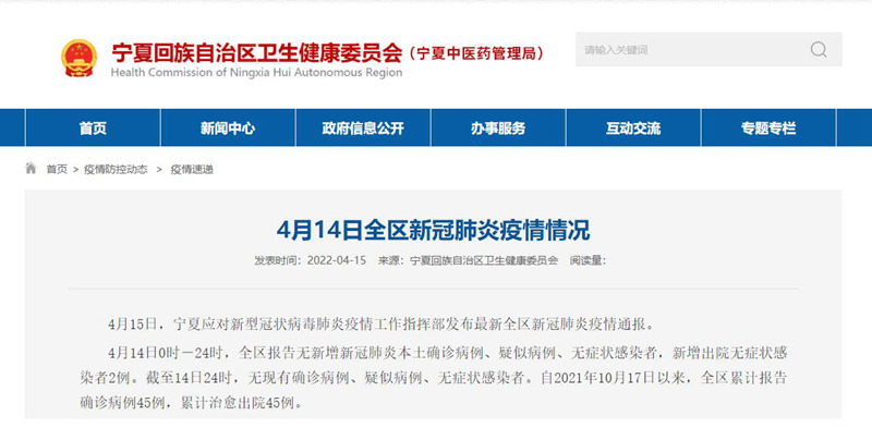 人民網銀川4月15日電 (劉峰、穆國虎)4月15日,寧夏應對新型冠狀病毒肺炎疫情工作指揮部發布最新全區新冠肺炎疫情通報。4月14日0時-24時,全區報告無新增新冠肺炎本土確診病例、疑似病例、無癥狀感染者,新增出院無癥狀感染者2例。