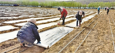 西吉縣馬蓮鄉馬蓮村農民搶墑覆地膜。見習記者 楊玉瑛 攝