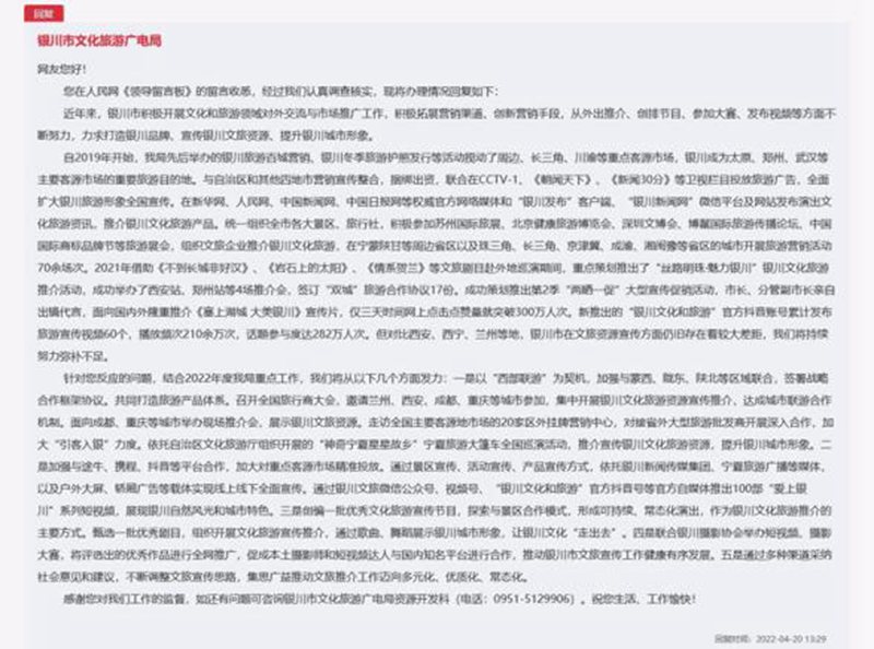 收到留言后,銀川市文化旅游廣電局公開作出回復;貜头Q,近年來,銀川市積極開展文化和旅游領域對外交流與市場推廣工作,積極拓展營銷渠道、創新營銷手段,從外出推介、創排節目、參加大賽、發布視頻等方面不斷努力,力求打造銀川品牌、宣傳銀川文旅資源、提升銀川城市形象。