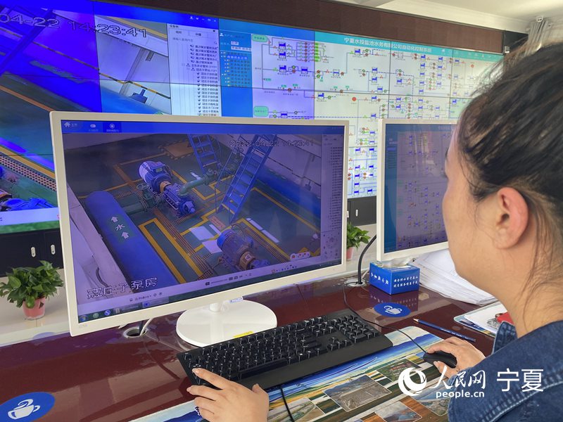 在鹽池水務公司的調控中心內,工作人員正在利用智能系統進行線上巡檢等日常工作。