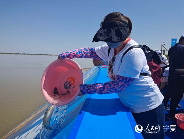 市民向黃河中投放流魚苗。人民網 李甜甜攝