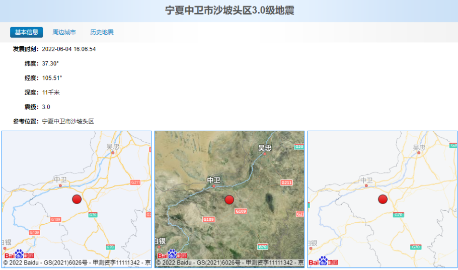 人民網銀川6月4日電 (秦瑞杰、張海峰)據中國地震臺網正式測定,6月4日16時06分,寧夏中衛市沙坡頭區發生3.0級地震,震源深度11千米,震中位于北緯37.30度,東經105.51度。