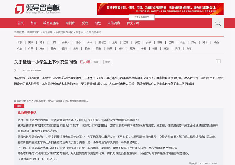 收到留言后,鹽池縣委督查室將階段性辦理情況作出公開回復;貜头Q,花馬池街道路及管網改造項目建設期限為5月至7月,因涉及地下管網鋪設,需將主路面開挖溝槽至5米左右深度。施工前,住建局已要求施工企業進場前將路段進行全面封閉,并發放了封路告知書。