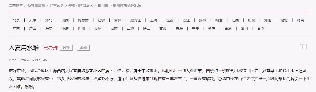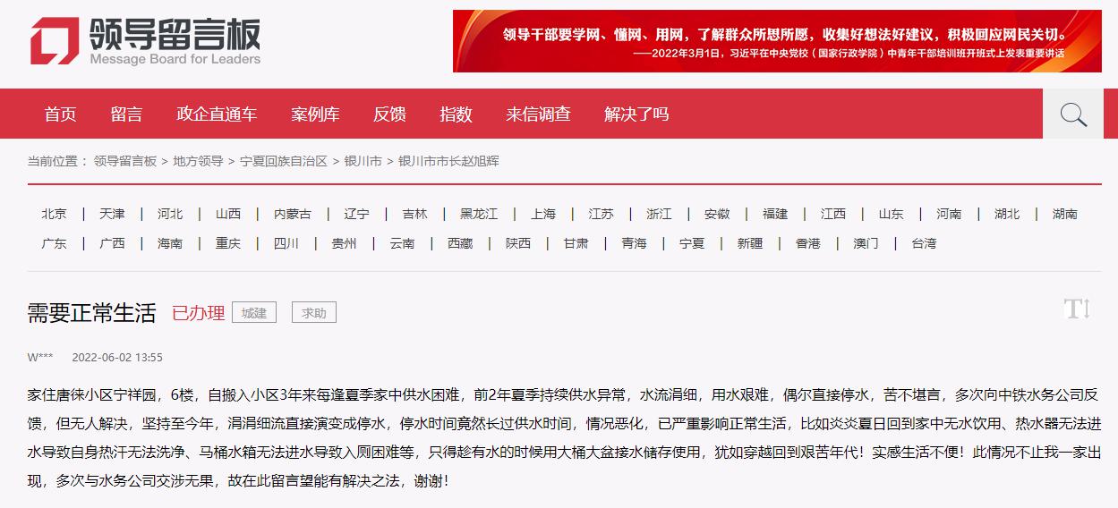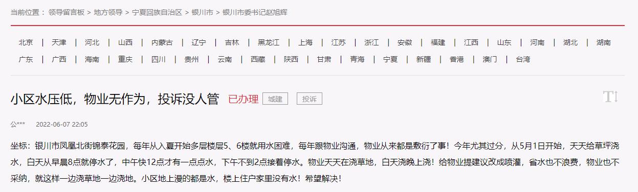 人民網銀川6月21日電(秦瑞杰、張海峰)“每年從入夏開始,5、6樓用水困難,小區地上漫得都是水,樓上住戶家里沒有水。希望解決!”“前幾天連續兩三天白天一滴水都沒有,聯系了水務公司,他們反饋說水壓小是存在的,需要向上級匯報。”“懇請幫我們解決一下用水困難。”進入六月,銀川市持續高溫天氣,讓市民的生活用水緊張了起來。近日,有多名網友通過人民網“領導留言板”給寧夏銀川市領導留言,希望能解決入夏以來用水難題。