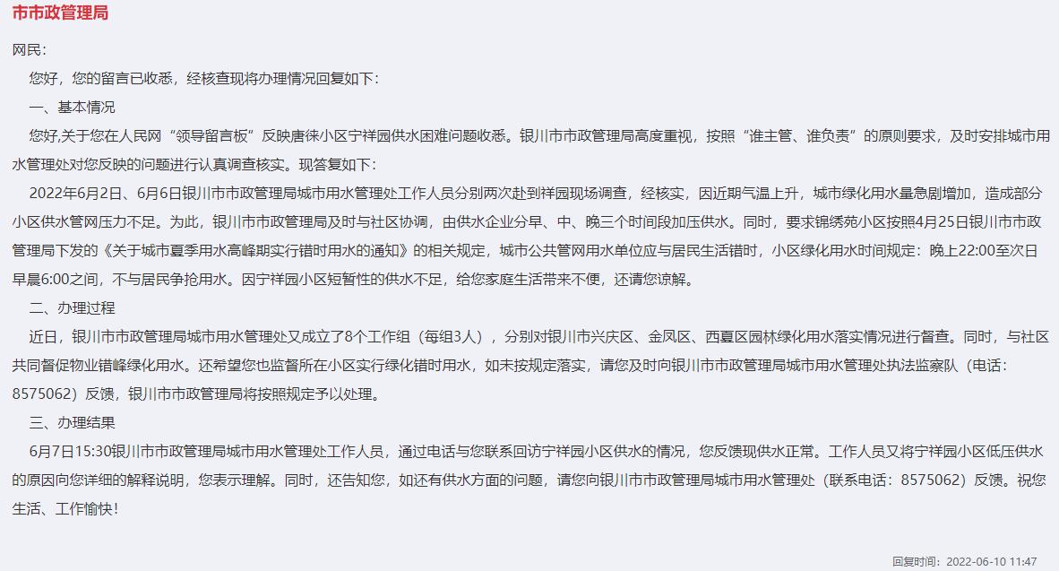 對于網友反映入夏用水難的問題,銀川市市政管理局留言回復稱,城市用水管理處工作人員現場調查后核實,由于近期氣溫上升,城市綠化用水量急劇增加,造成部分小區供水管網壓力不足。