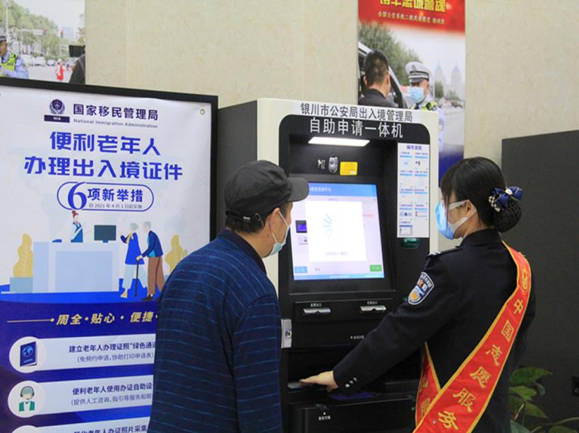 銀川市出入境管理局工作人員幫助老年人辦理業務。圖片由銀川市公安局出入境管理局提供