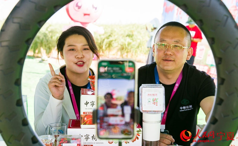 商戶在枸杞地里直播售賣枸杞。人民網 張海峰攝