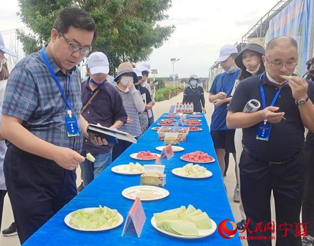 各地經銷商觀摩后品鑒寧夏優質瓜果。人民網 李甜甜攝