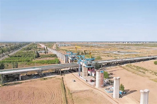 當天,記者在施工現場看到,在包銀高速鐵路三標段建設現場,30多名工人正在對銀川繞城高速立交特大橋連續梁邊跨直線段進行施工作業。這座連續梁由于上跨銀川北繞城高速,是整個標段4處連續梁中施工難度最大的一座,為確保施工進度,廣大建設者連續作戰,為今年10月這座特大橋連續梁順利合龍打牢基礎。