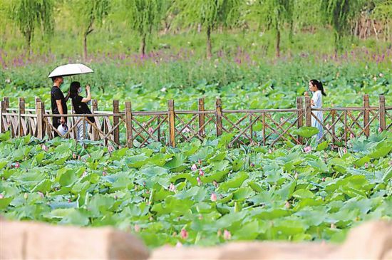 荷花池間,游客在木橋棧道留下美好生活瞬間。