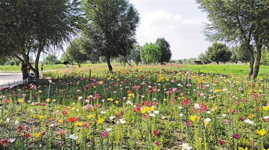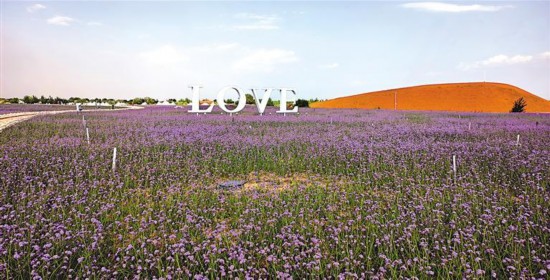 在金沙島休閑度假區,藍天、白云、黃沙、薰衣草共同構成了沙漠美景。