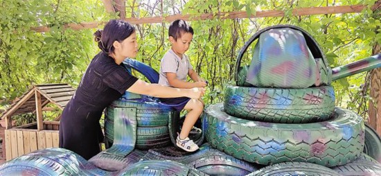 剛入冶家村,就聽到悠揚的薩克斯吹奏聲,村里人笑臉相迎,不急不慢地在陰涼里踱步。涼亭里有老人聊天,孩子們的笑聲從游樂園方向傳來。王慧和家人第一眼就看中了民宿和農家樂完美融合的巧媳婦莊園,上下兩層的木質裝修風格,與綠水青山相映成趣,24間客房干凈舒適,老板娘親自掌勺烹制當地的特色美食。他們選擇住在一層第一間,開門就能看到秋千、菜園和涼亭,右轉就是兒童游樂園,兒子最喜歡的就是老板冶三成用廢舊輪胎做成的迷彩坦克。