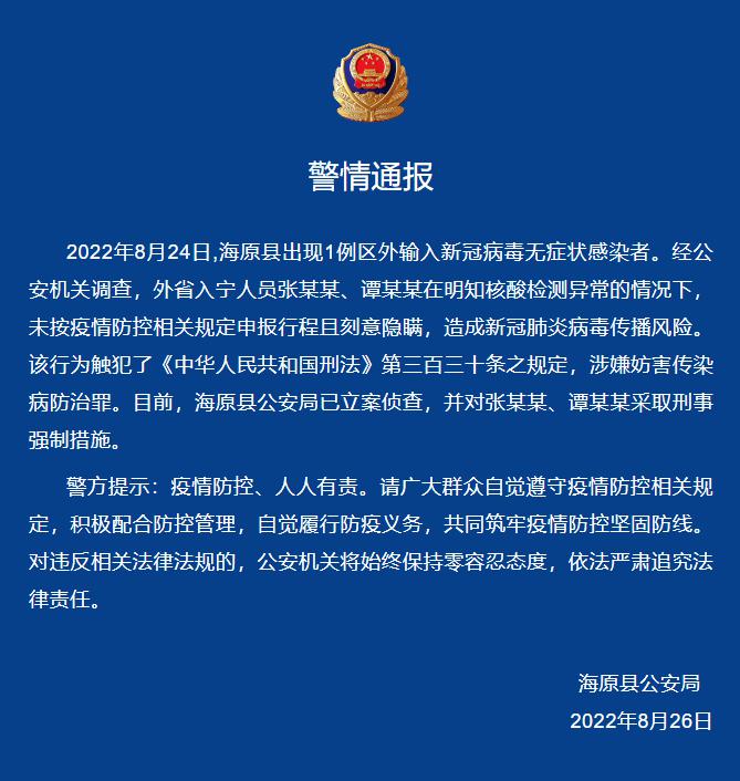 人民網銀川8月26日電 (秦瑞杰、張海峰)寧夏海原縣公安局26日發布警情通報:8月24日,寧夏中衛市海原縣出現1例區外輸入新冠病毒無癥狀感染者。經海原縣公安機關調查,外省入寧人員張某某、譚某某在明知核酸檢測異常的情況下,未按疫情防控相關規定申報行程且刻意隱瞞,造成新冠肺炎病毒傳播風險。該行為觸犯了《中華人民共和國刑法》第三百三十條之規定,涉嫌妨害傳染病防治罪。目前,海原縣公安局已立案偵查,并對張某某、譚某某采取刑事強制措施。