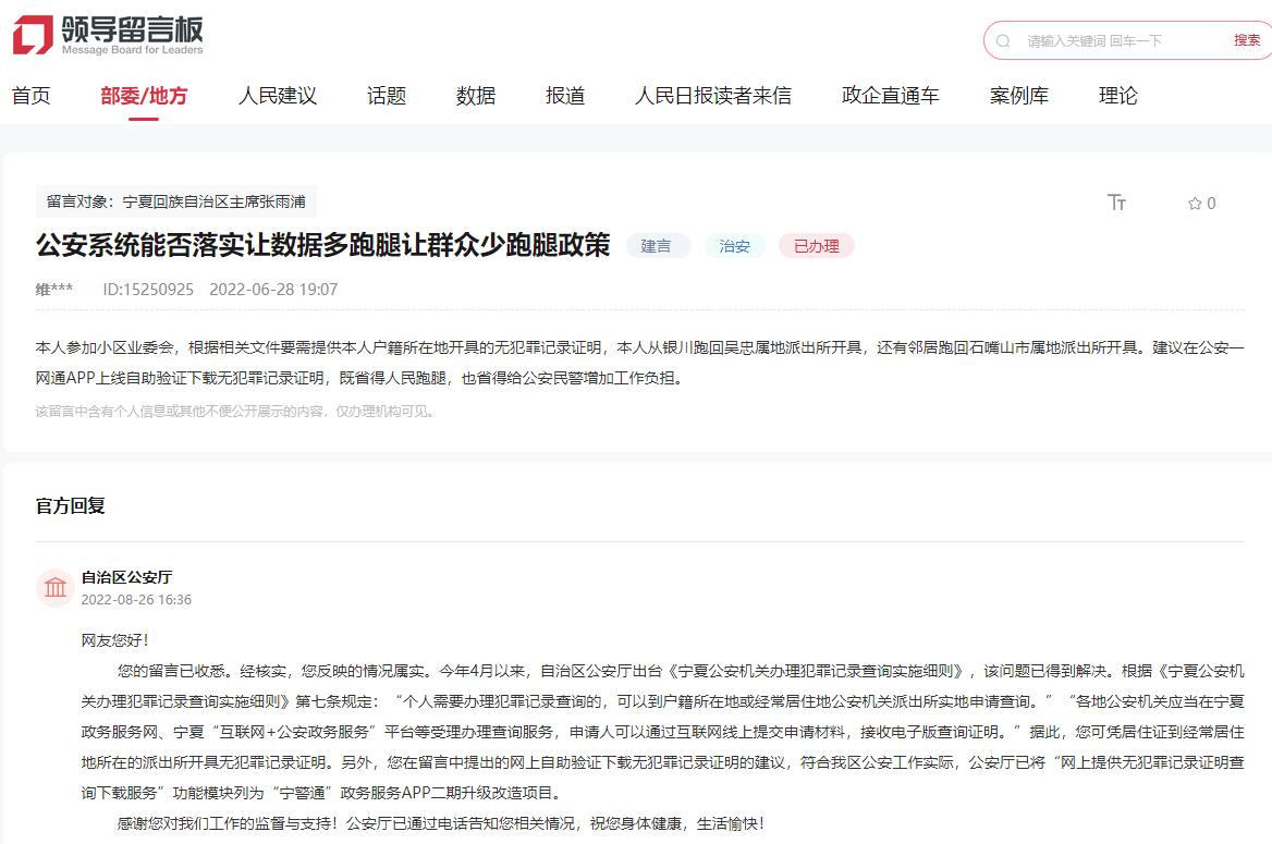 人民建議丨網友建議無犯罪記錄證明網上辦 寧夏:將優化該功能