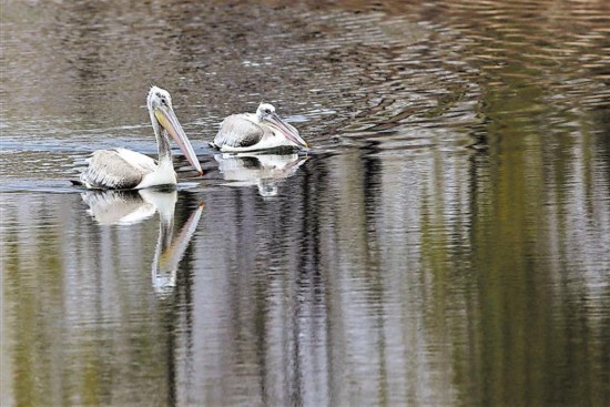 黃河灘涂上國家一級保護動物卷羽鵜鶘悠然自在地游弋。